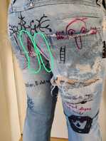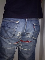 Weiter ging es eines schönes Abends tatsächlich nicht mit zerfetzen oder Rissen. Auch nicht mit dem freilegen von weißen Fäden. Nein es wurde gewünscht das sie auch etwas Edding abbekommen solle. Ui, ui, Edding auf meine tolle Jeans. Da hatte ich nicht so das gute Gefühl. Wollte ich sie doch auch weiter noch ein wenig draußen tragen können. Das hatte ich bisher aber nur mit zerfetzen Jeans gemacht, nicht mit bekritzelten. Naja, es half alles nichts, nach dem es mehrfach nett gewünscht war ließ ich mich doch dazu hinreisen den Edding zu holen. Es sollte aber nur unverfängliches und nichts so auffälliges werden. So bekam sie an diesem Abend einen Kilroy auf die Arschtadche und den Schriftzug Levis 501 auf den Oberschnekel. Die nächsten Tage trug ich sie dann auch nur zu Hause und nicht draußen. Einige Zeit später überkam es mich dann aber, ok wurde auch leicht dazu angestiftet, und ich zog sie an und fuhr mit der Bahn in die City. Das ist das zweite Bild. Ein Glück war nicht viel los, den ich war doch ganz schön aufgeregt, was wohl die anderen Fahrgäste denken und sagen würden. Noch schlimmer wäre es wohl gewesen, ich hätte jemand bekanntes getroffen. Aber aller verlief ruhig und so entspannte ich mich nach und nach. Später die Heimfaht konnte ich dabei direkt schon ein wenig genießen. Es sollte auch nicht der letzte Ausflug mit ihr bleiben.