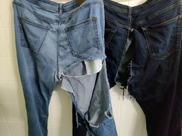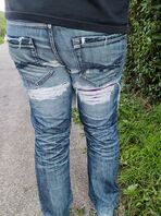 Hier noch was passend zum Thema hinten mittig zerrissen. Da war ich gestern Abend noch ne Runde draußen, und was sehe ich da neben dem Kleidercontainer liegen? Genau ne Jeans mit dem Größenetikett gut lesbar. Da denke ich mir, das muss doch ein Wink des Schicksals sein, die Größe ist fast meine. Also heb ich das Teil vom Boden auf und denk im ersten Moment, wer schmeißt den ne fast neue Jeans weg. Aber dann sehe ich warum, richtig, sie ist heftig zerfetz hinten. Das sieht nicht so aus als ob das so ganz zufällig passiert wäre. Also während ich noch so überlege was tun, sehe ich da ist noch eine zweite Jeans und ne Plastiktüte, also schnapp ich mir die Tüte und rein mit den zwei Jeans und mitgenommen. Hier die beiden Fetzen: