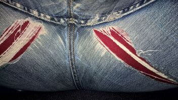 Zu Hause angekommen trug ich erstmal wieder meine Alltags Jeans und die Jeans aus dem Urlaub verschwand in den Hintergrund. Eines Abends, es müsste so ein kurzer dunkler Winterabend Anfang 2018 gewesen sein, saß ich vor dem Rechner und schrieb ein paar Antworten in dem damaligen Forum für geile Jeans und alles was dazu gehört. Dabei kam mir in den Sinn das es doch viel toller wäre neben dem Schreiben auch eine coolere Jeans anzuziehen. Also holte ich die Jeans aus dem letzten Urlaub aus dem Schrank und sofort kam wieder das Erlebnis des Urlaubs in Erinnerung und die gute Zeit. Noch bevor ich sie also anzog schaute ich mir die zwei Risse an, die schon ein wenig größer geworden waren als damals als ich sie mit dem roten Stoff Unterlegt hatte. Aber eigentlich war es etwas schade dass der schöne rote Stoff nur so ein wenig zu sehen war, dabei hatte ich aus irgendeinem Grund ihn doch direkt etwas großflächiger unter die Minirisse genäht. So juckte es mich in den Fingern und ich spielte ein wenig an den Rissen herum und zupfte ein wenig an dem schon etwas dünnen Jeansstoff. Plötzlich riss er auf einer Seite ein paar Zentimeter weiter auf. Ui, im ersten Moment dachte ich, puh jetzt ist der Riss und das geflickte vielleicht doch etwas zu auffällig, aber ändern konnte ich jetzt auch nichts mehr. Also hörte ich erstmal mit dem zupfen auf und zog nun endlich die Jeans an. Der weiche Jeansstoff fühlte sich dabei einfach herrlich an. Und direkt war vergessen das der Riss größer wurde. So mit dem super Gefühl der getragenen Jeans gab es erstmal einen regen Austausch mit ein paar anderen Im Forum über die ein oder andere Jeans. Einige Zeit später stand ich mal auf um in die Küche zu gehen, dabei kam ich am Spiegel vorbei, da dachte ich mir, jetzt muss ich doch mal schauen wie auffällig der Riss nun ist. Okay, er würde sich wohl nun nicht mehr verstecken lassen, aber eigentlich sah er richtig geil aus, und ich hatte das rot damals auch gewählt weil ich irgendwie wissen wollte wie es ist wenn man so einen krassen Farbkontrast hat. Früher kannte ich Jeans immer nur geflickt mit möglichst gleichen Jeansstoff, so das es möglich wenig auffiel. Aber gerade das Rot und die weißen Fänden gaben wie ich fand einen schönen Kontrast und ich war nun überzeugt dass der größere Riss sicher kein Fehler ist. Und für zu Hause könnte ich die Jeans auf alle Fälle tragen, egal wie auffällig der Riss ist. So ging dann der Abend langsam zu Ende und ich zog die Jeans aus da es Zeit fürs Bett war. Der Jeansstoff fühlte sich dabei so herrlich weich und abgetragen an.